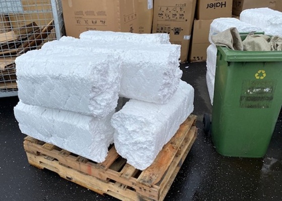 Da EPS-Schaum zwar sehr leicht, aber sehr voluminös ist, füllt er bei Anhäufung schnell den Lagerraum.